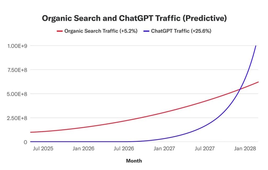 Иллюстративный прогноз, если темпы роста останутся прежними: реферальный трафик с ChatGPT (+25,6% в месяц) по сравнению с органическим поиском (+5,2%). Это экстраполяция, основанная на публично обсуждаемых данных/оценках Siege Media; реальная динамика может отличаться из-за сезонности и изменений в поведении пользователей. 🔗 Reddit.